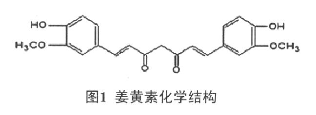 藥姜黃具有破血行氣、通經(jīng)止痛之功效,有效成分為姜黃素(curcumin)、脫甲氧基姜黃素及雙脫甲氧基姜黃素,姜黃素是其中主要有效成分[1]。姜黃素曾作為香料和食物色素廣泛用于食品工業(yè)[2],其結(jié)構(gòu)式見(jiàn)圖1。近年,姜黃素的藥理活性不斷發(fā)現(xiàn),如抗炎、清除自由基及抗癌等[3],其中一些藥理作用已進(jìn)入臨床驗(yàn)證階段?,F(xiàn)將近年國(guó)內(nèi)外有關(guān)姜黃素的臨床研究成果作一綜述,以期為姜黃素的應(yīng)用與開(kāi)發(fā)研究提供參考。