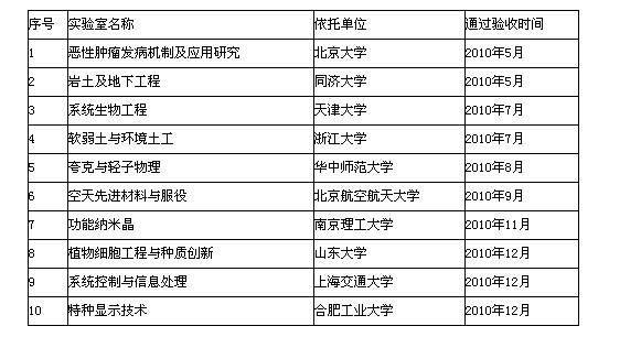 依據(jù)《高等學校重點實驗室建設與管理暫行辦法》的規(guī)定,我部于2010年相繼組織專家對部分建設期已滿的教育部重點實驗室和省部共建教育部重點實驗室進行了驗收。在有關省(市)教育廳(教委)和依托單位的大力支持下,各實驗室建設期間按照建設計劃任務書的要求,在凝煉研究方向、實驗環(huán)境和條件、人才隊伍、管理體制與運行機制、對外開放與交流等方面的建設取得了明顯進展,達到了教育部重點實驗室驗收標準。經(jīng)我部組織驗收專家組對“惡性腫瘤發(fā)病機制及應用研究”等教育部重點實驗室進行現(xiàn)場驗收,我部同意上述實驗室通過驗收(名單見附件1、2)。