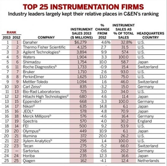 在今年揭曉的2013年全球儀器公司排名前25名單中,排名前十情況與2012年變化不大,排名第一依然為丹納赫(Danaher),排名第二為賽默飛世爾科技(Thermo Fisher Scientific,Life Technologies的2013年收入未記在內(nèi)),排名第三為安捷倫(Agilent Technologies)。其中,排名發(fā)生最大變化的是羅氏診斷(Roch Diagnostics),它從2012年排名第11上升至排名第6;并且由于Life Technologies被賽默飛世爾收購,Life Technologies從排行榜中消失。此外,賽多利斯(Sartorius)首次進(jìn)榜,排名第23位。詳細(xì)名單名單見下: